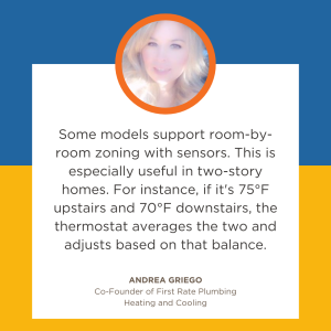 “Some models support room-by-room zoning with sensors. This is especially useful in two-story homes. For instance, if it’s 75°F upstairs and 70°F downstairs, the thermostat averages the two and adjusts based on that balance.” — Andrea Griego