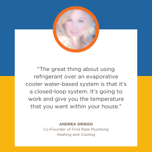 “With an evaporative cooler, anytime your home is hot, that evaporative cooler works really well in a dry climate. It actually puts humidity into your house and eventually cools it down… However, it does not work really well when it’s high humidity outside.” — Andrea Griego, First Rate Plumbing Heating and Cooling